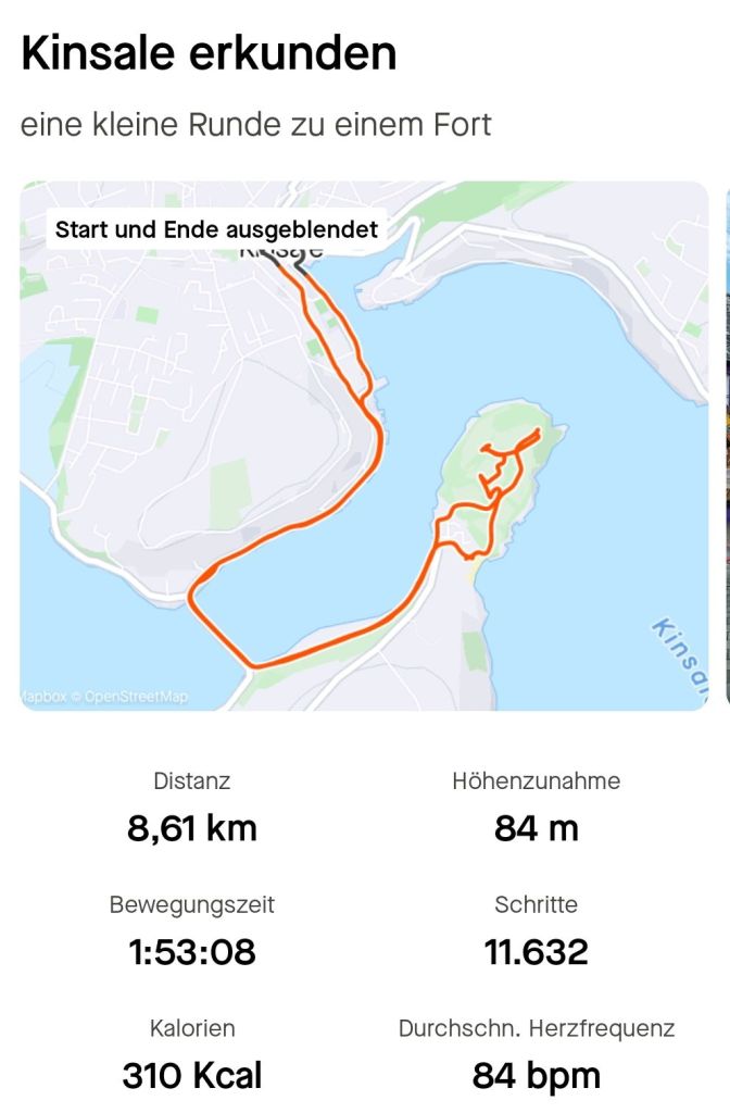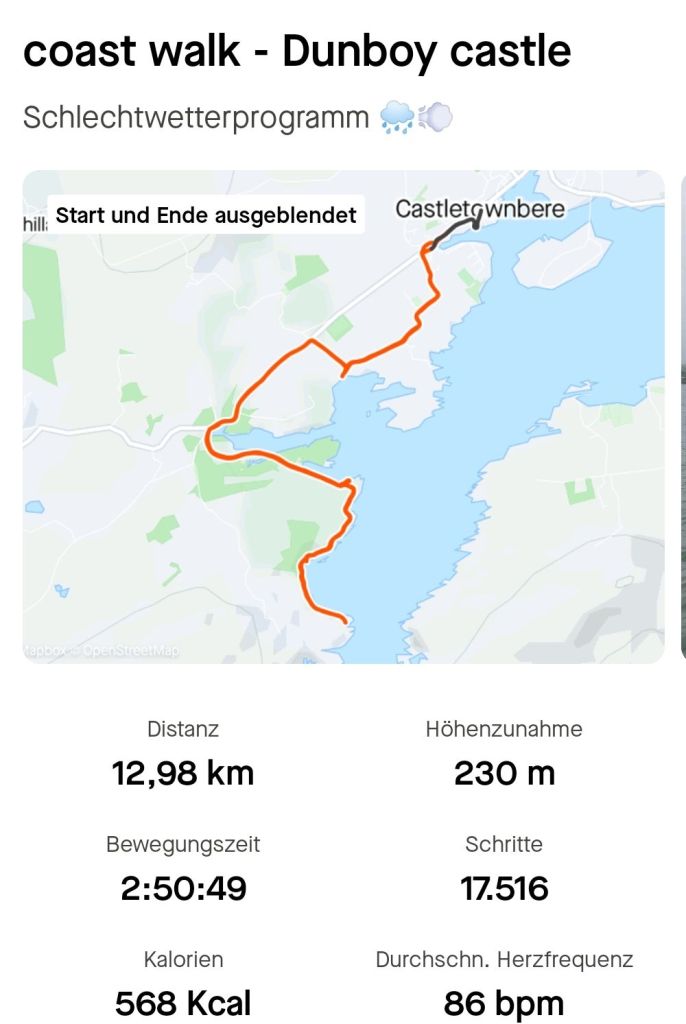 weil ich ja Zeit habe, während ich auf Harald warte, der gemeint hat, er fährt das heute bis nach Kinsale fertig, habe ich noch eine kurze Wanderung zu einem Fort gemacht. bin bei einem Strand mit einem Saunafass vorbeigekommen – das werden wir morgen ausprobieren, damit uns endlich einmal warm ist 🤣