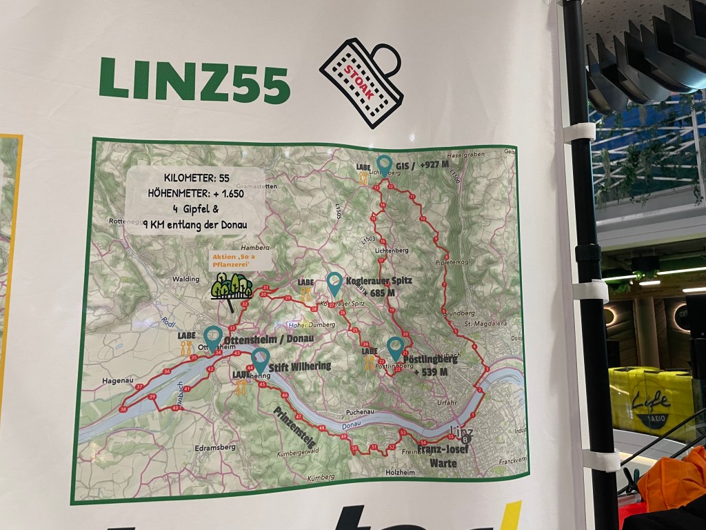 so kommen die Österreichischen Ruderer zu NachwuchsDank der ausgezeichneten Beschriftung haben uns nicht einmal wir verlaufenund es wäre keine Wanderung für uns, wenn es uns nicht ordentlich einwascheln würdeletzte Labe beim Stift Wilhering – jetzt sind es nur noch 11km bis ins ZielEin toller Abschluss ist der letzte Streckenabschnitt über den Prinzensteig (fast so wie der Matrassteig)mit Ausblick auf die neue BrückenbaustelleZieleinlauf in der Linzerie Danke Susi, daß du das mit mir gemacht hast – 55km in 12h eine sensationelle Leistung