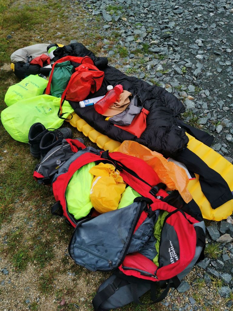 Nach einer veregneten Nacht war der Morgen dann zum Glück trocken, aber halt neblig. Hab das ganze nasse Zeug einmal in einen Sack gesteckt. Die Organisation im Zelt klappt noch nicht ganz einwandfrei, aber ich hoffe, es wird besser mit der Zeit.
