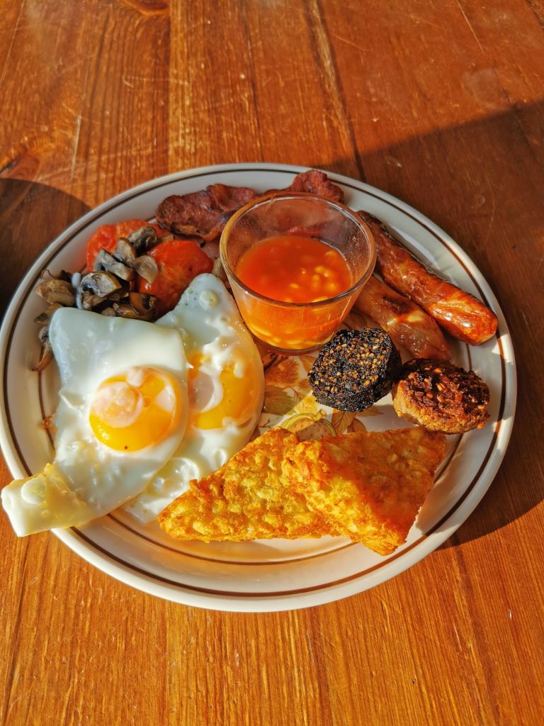 So stell ich mir das vor: super geschlafen und dann ein geniales Frühstück. mein Zimmergenosse Adam aus Colorado hat sich ein typical English Breakfast gegönnt.