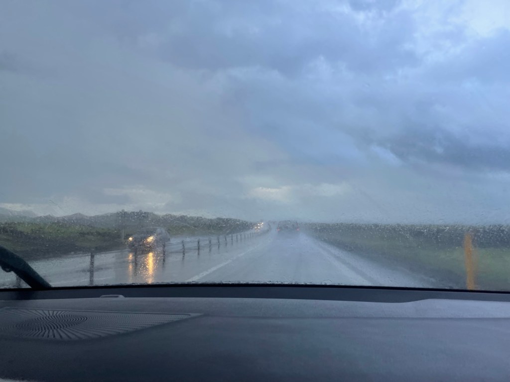 Nächster Stopp sollte eine sehr einsame Lagune zum aufwärmen werden (10 Minuten Fußmarsch in eine Schlucht), auf dem Weg dorthin hat es uns aber dann so eingewaschelt, dass wir umgedreht haben – die Aussicht nach dem heißen Bad in die waschelnassen Sachen zu schlüpfen war nicht sehr einladend. Okay es war auch nicht fein mit dem nassen Zeug im Auto zu sitzen, aber wenigstens warm 😂.