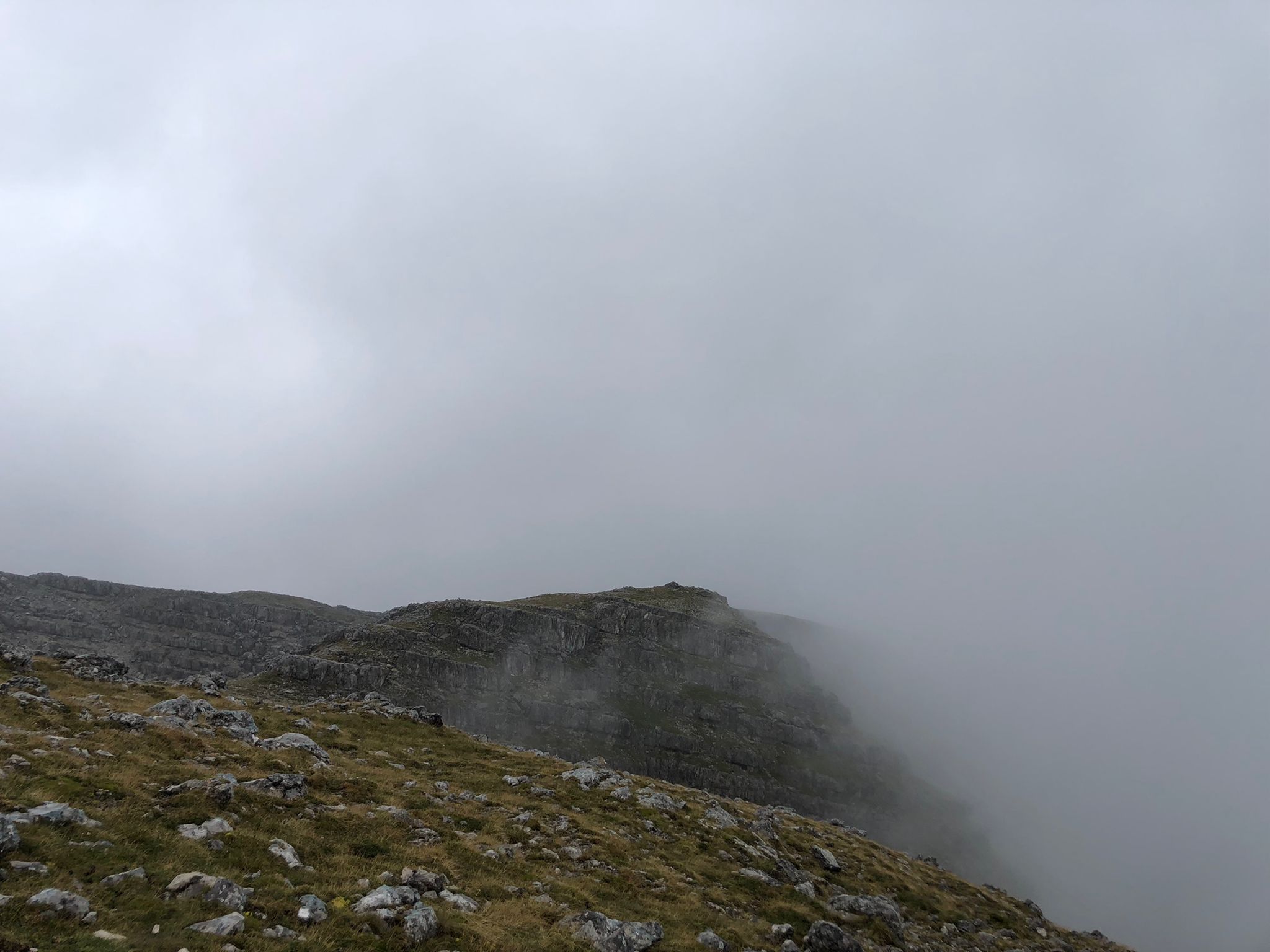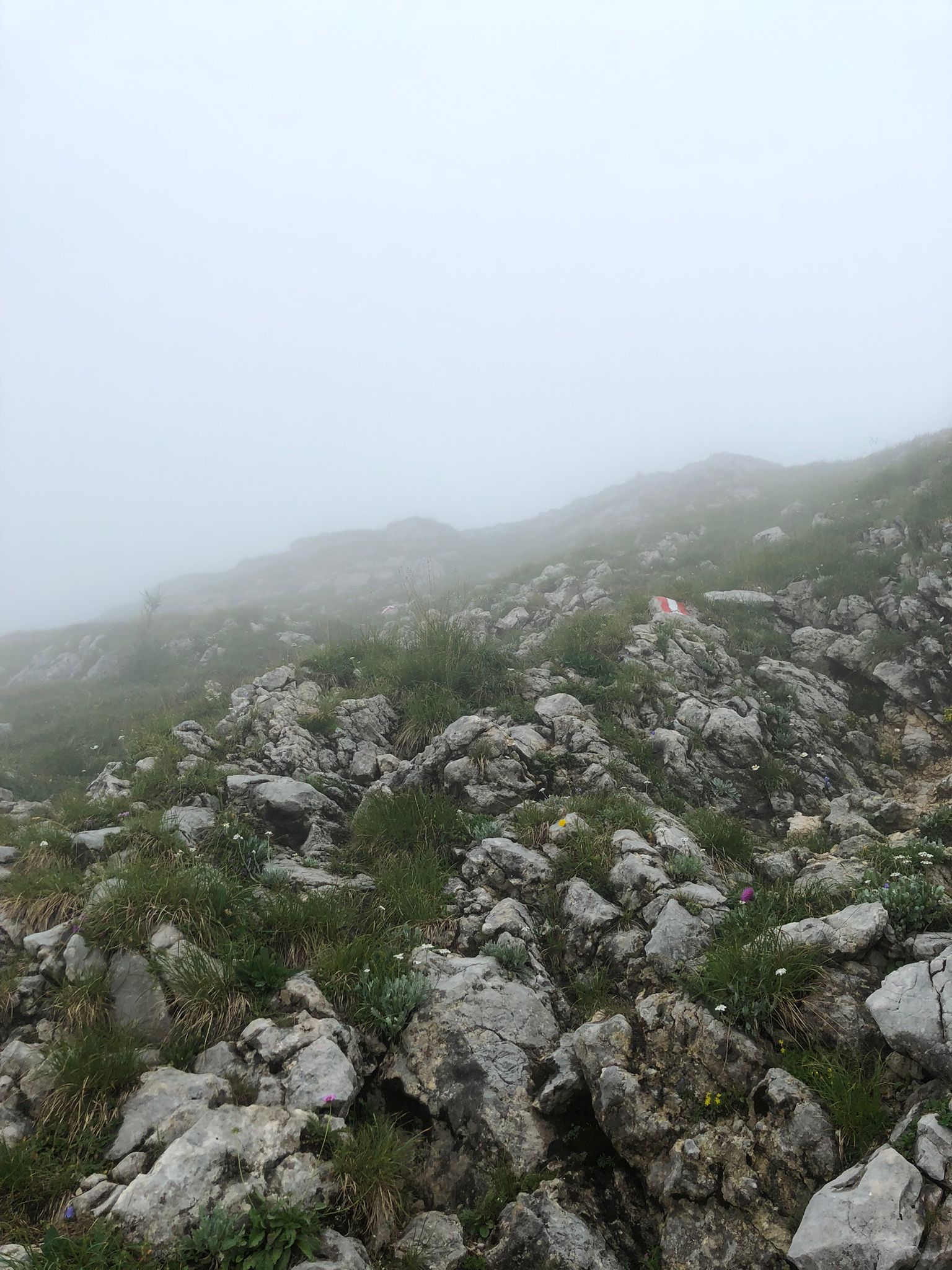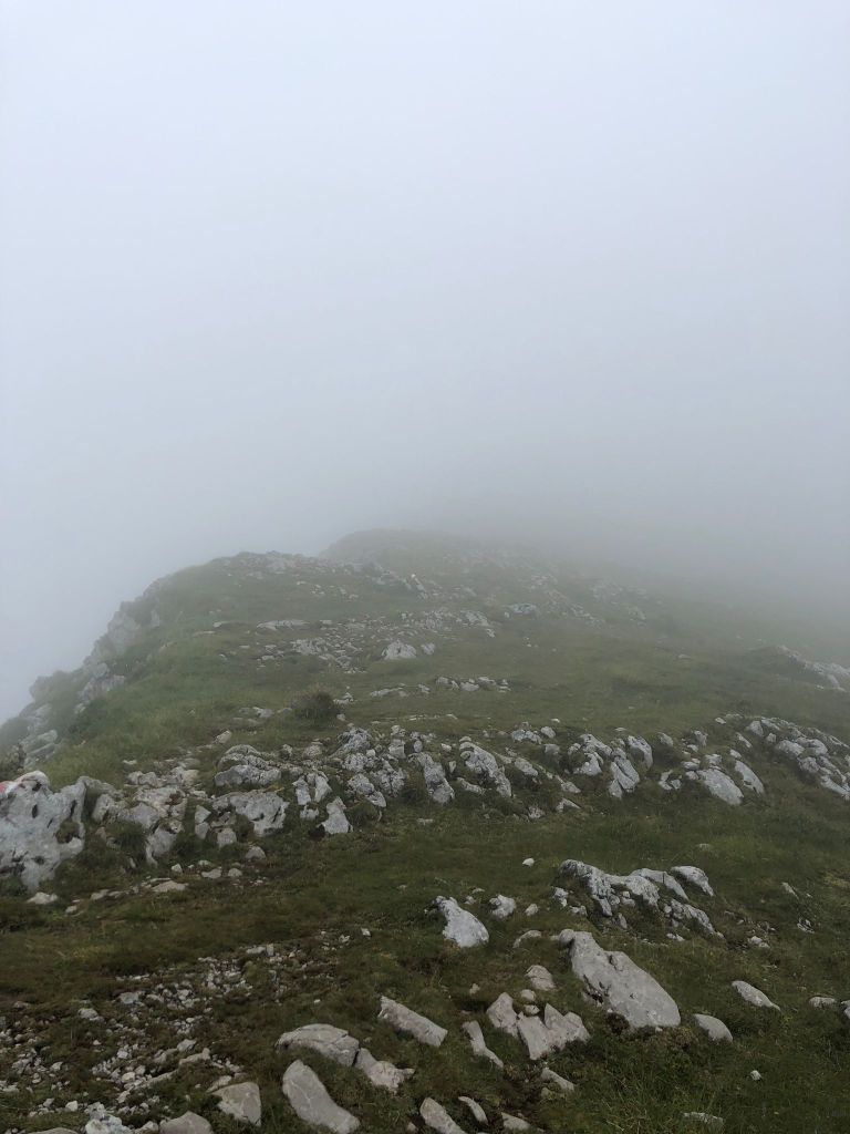 Auf der Wurzeralm hat dann das Norwegenfeeling begonnen. Rauf zum Roten Wand Sattl (kurz hat man sie gesehen) hats ziemlich geregnet und die Sicht ist auch nicht besser geworden. Weiter rauf zum Toten Mann wars dann – sagen wir mal – suboptimal. Kletterei in nassem rutschigen Fels ist nur bedingt lustig, aber wir haben zum Glück nicht gesehen, wie weit wir runter gefallen wären. 🌫️