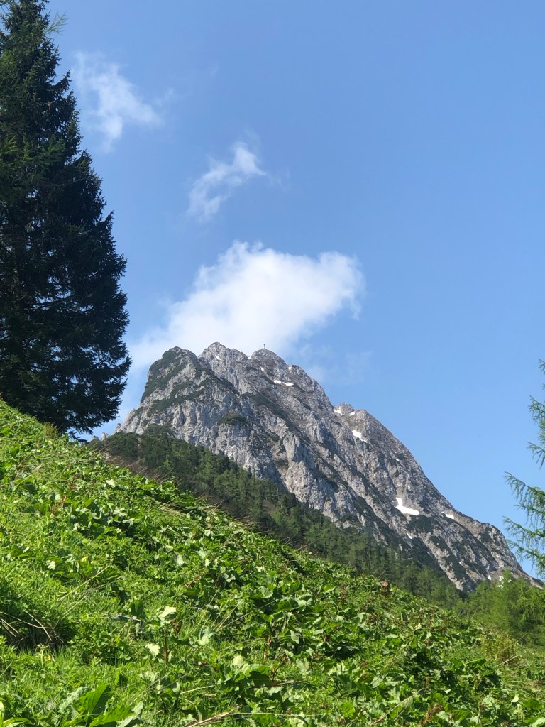 Juhuu, wir starten bei schönem Wetter, den Lugauer immer im Blick – bis zum Schoderkreuz. Das ist ziemlich steil und schottrig – und wir müssen es zugeben:wir sind Hitze nicht mehr gewohnt 🥵. Aber die Aussicht ist der Wahnsinn. Das sind wir auch nicht gewohnt. 🤣