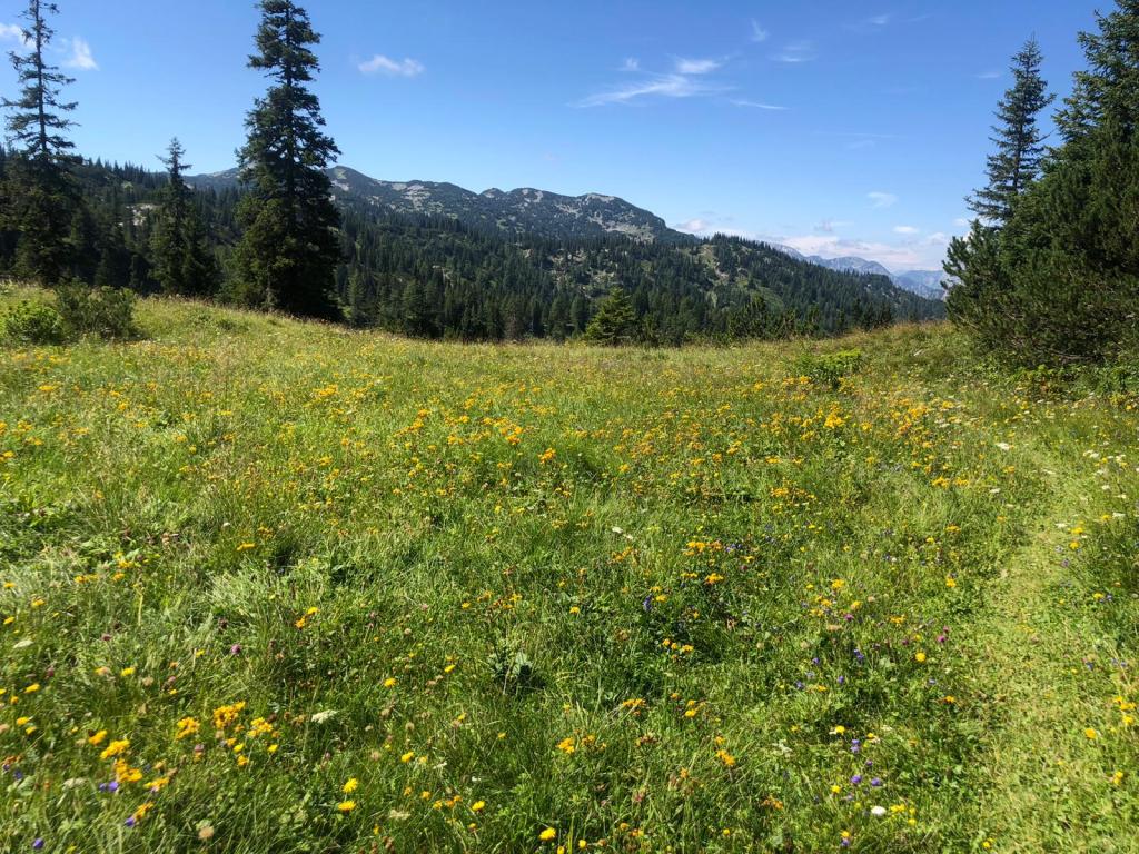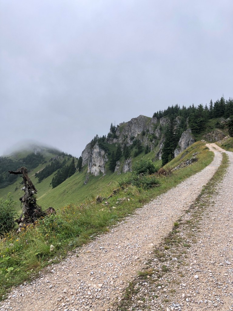 Wir haben dann aber einmal den ärgsten Regen abgewartet und sind trocken weggekommen – das gute Frühstück hat uns das Warten erleichtert 😋. Juhuu. Bis zur Seealpe ist es wunderschön durch den Wald und über Almen.