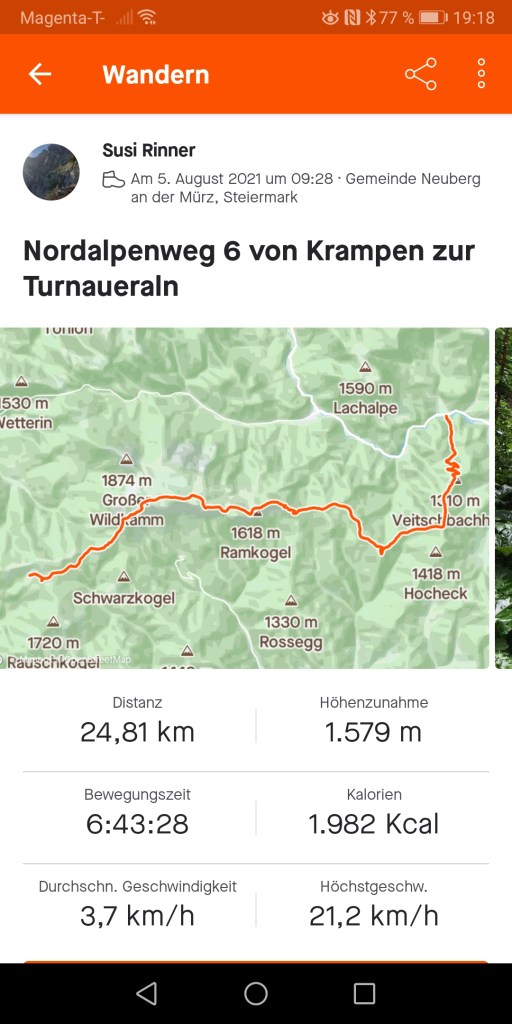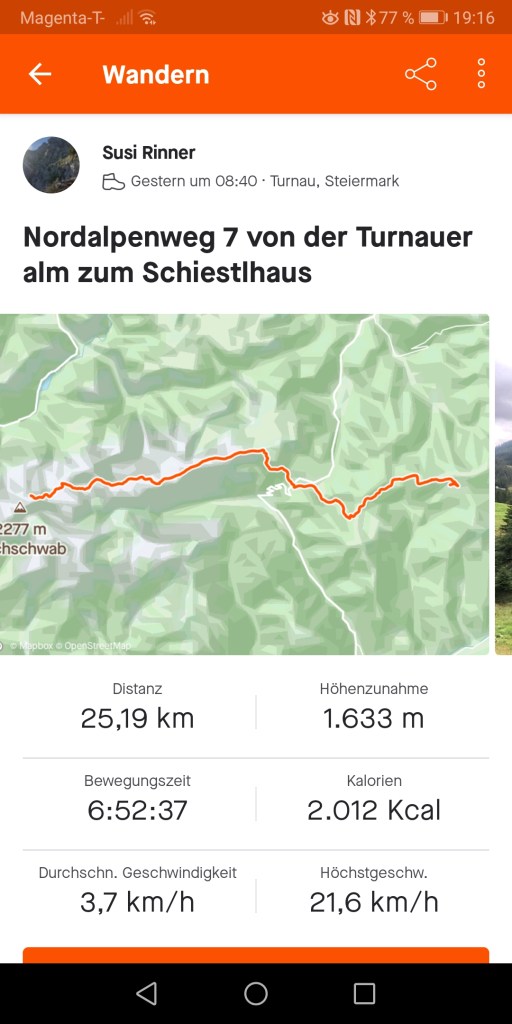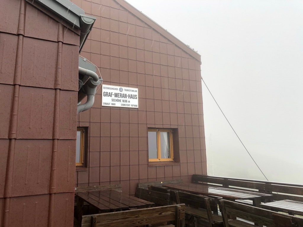 Der Weg auf das Schneealpenhaus war steil und viele, viele, viele Klopausen waren notwendig.Danke an Sonja für die Geduld und die Taschentücher 😘. Strava und runtastic zeigen uns ca. 50 km heute an. Irgendwo muss ein cooler flying fox gewesen sein, den wir nicht mitbekommen haben 😂. Schneealpenhaus ist super warm und das Essen ist super gut. Auf der morgigen Etappe gehen wir durch Durchfall. Sehr passend für mich. Sonja hat schon gefragt, ob sie ein Foto von mir machen darf
