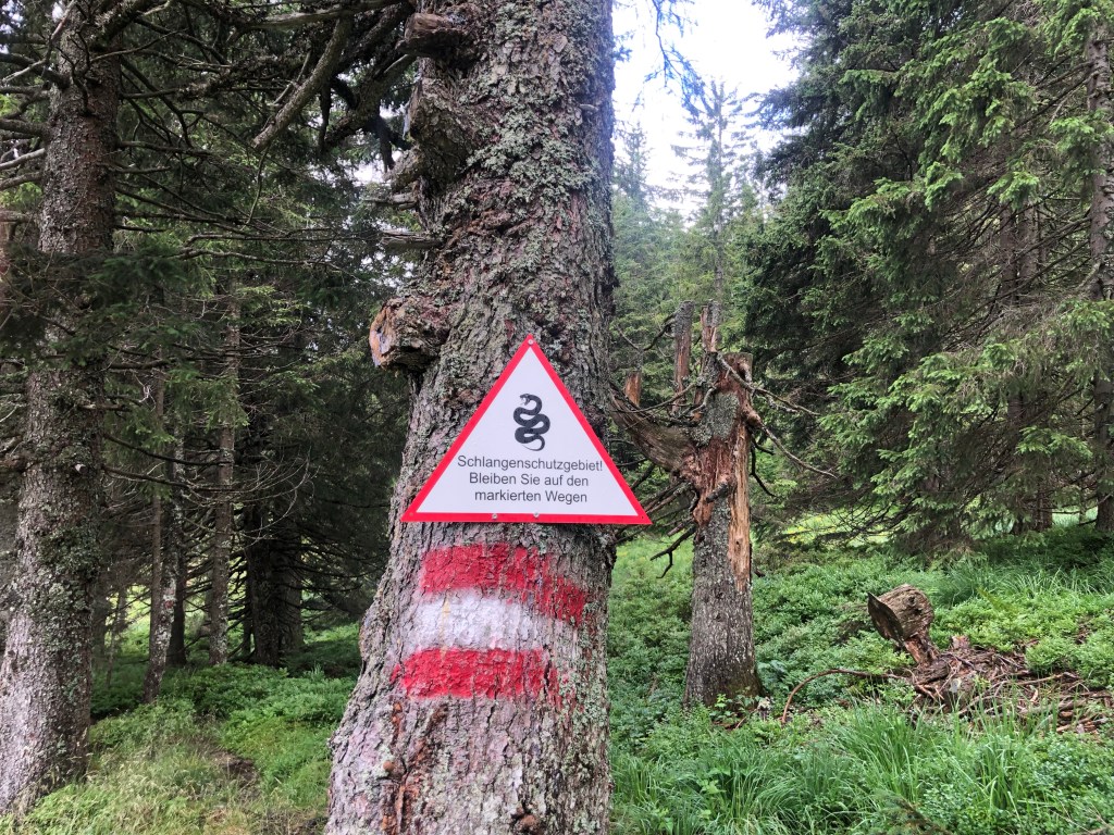 Immer den Schneeberg im Blick (das schaut nach vielen Höhenmetern aus 😭) geht’s weiter. Sonja rettet mich vor einer großen schwarzen Höhlenotter, vertreibt sie und führt mich an der Hand vorbei (sonst würde ich noch immer dort starr stehen 😭)